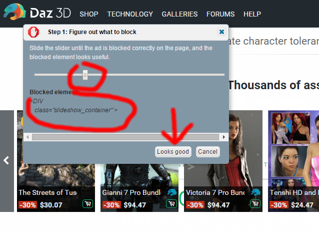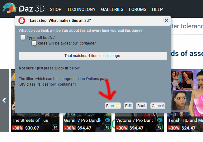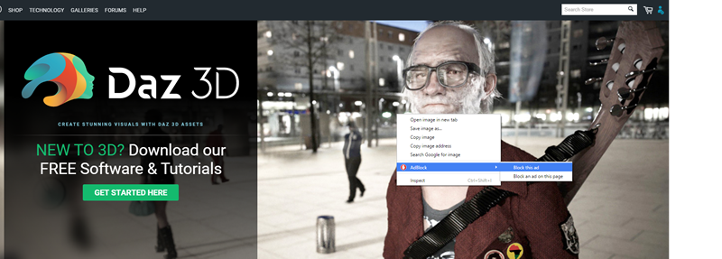 Make sure you have adblock installed in your browser ( https://getadblock.com ), then with it active, visit www.daz3d.com. Rightclick on the image you want to hide: