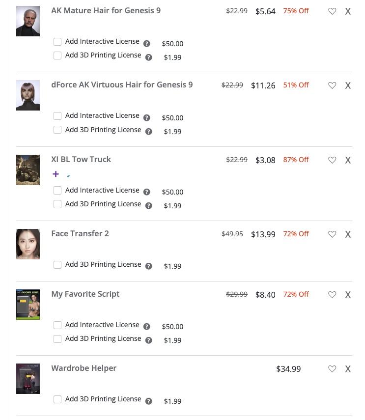 And the item from a Featured Artist store is not getting the discount it should: it's not shown on this screenshot, but when I tested it alone with the TNR, it got a 60% discount, not a 65% one as advertised but it did get the 30% extra discount due to having a TNR and a Daz+ NR in the cart.