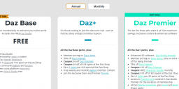 I'm guessing Daz is still working on the old Daz+ subscription status showing as "N/A" and displaying as base member (since it's still an issue), but there's a new thing: the buttons in annual membership contain no text at all at the moment. They look clickable (color changes when moused over), but I didn't try them.