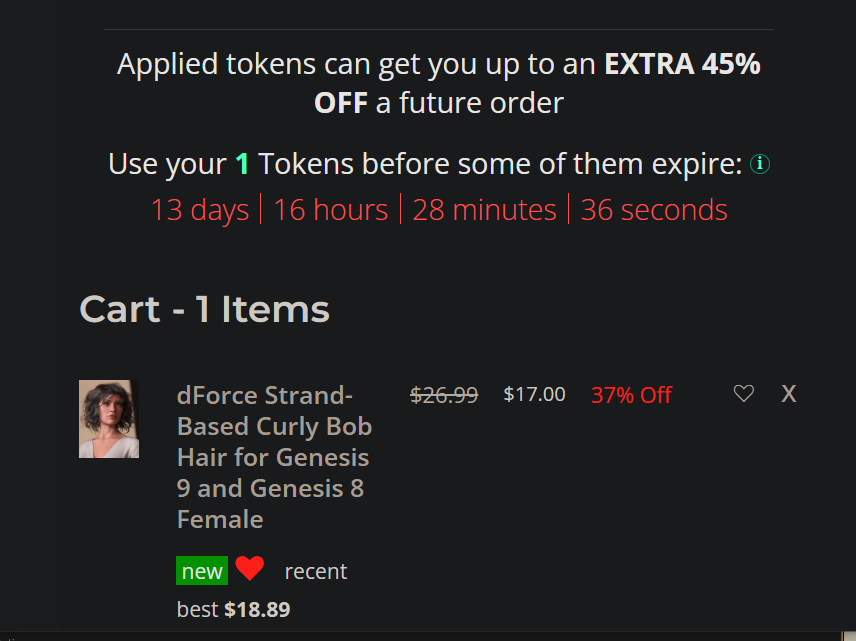 Borked is right! I think the 51% off is supposed to be only Daz Originals but some/a lot of PA items are showing it too. The actual sale is not applying the Gold Star 45% off, just the overall 10% or 20% off as Daz+ member or Premier (30% off plus 10% off = 37% off for Daz+, 30% plus 20% off = 44% off for Premier) when it should be 45% off plus either 10% or 20% off (50.5% off Daz+, 56% off Premier). I'm not going to add a newly mad item, there's nothing I want anyway, even if I was so inclined. I'm giving up for the evening and will have a look again in the morning. If it's corrected I will purchase, if not, I won't.