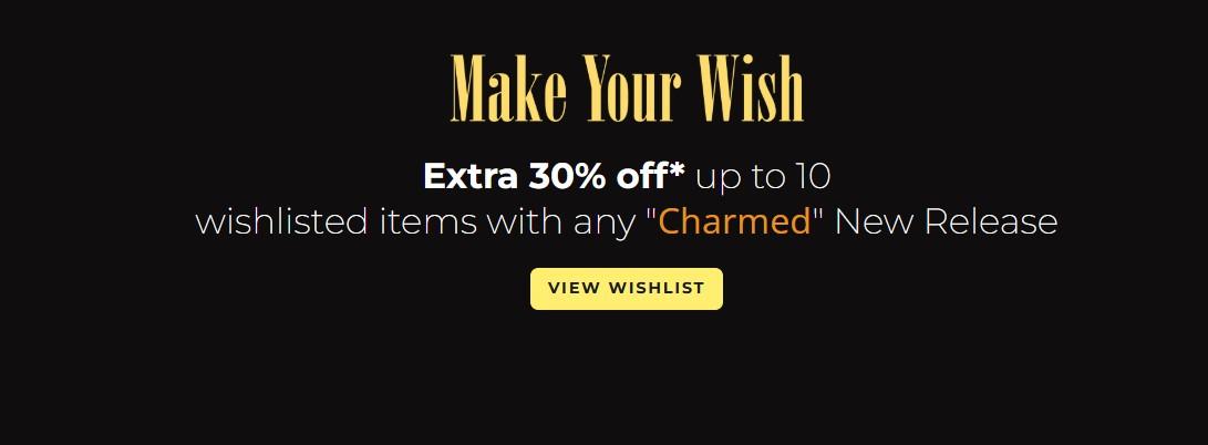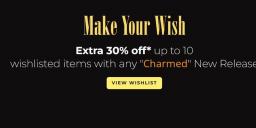 Am I missing something here? I'd like to take them up on this, but I'm not seeing predictable results when I have a cart with a new "Charmed" item and add various wislisted items (ie, old, new, on sale already, not). There's an asterisk and no fine print.