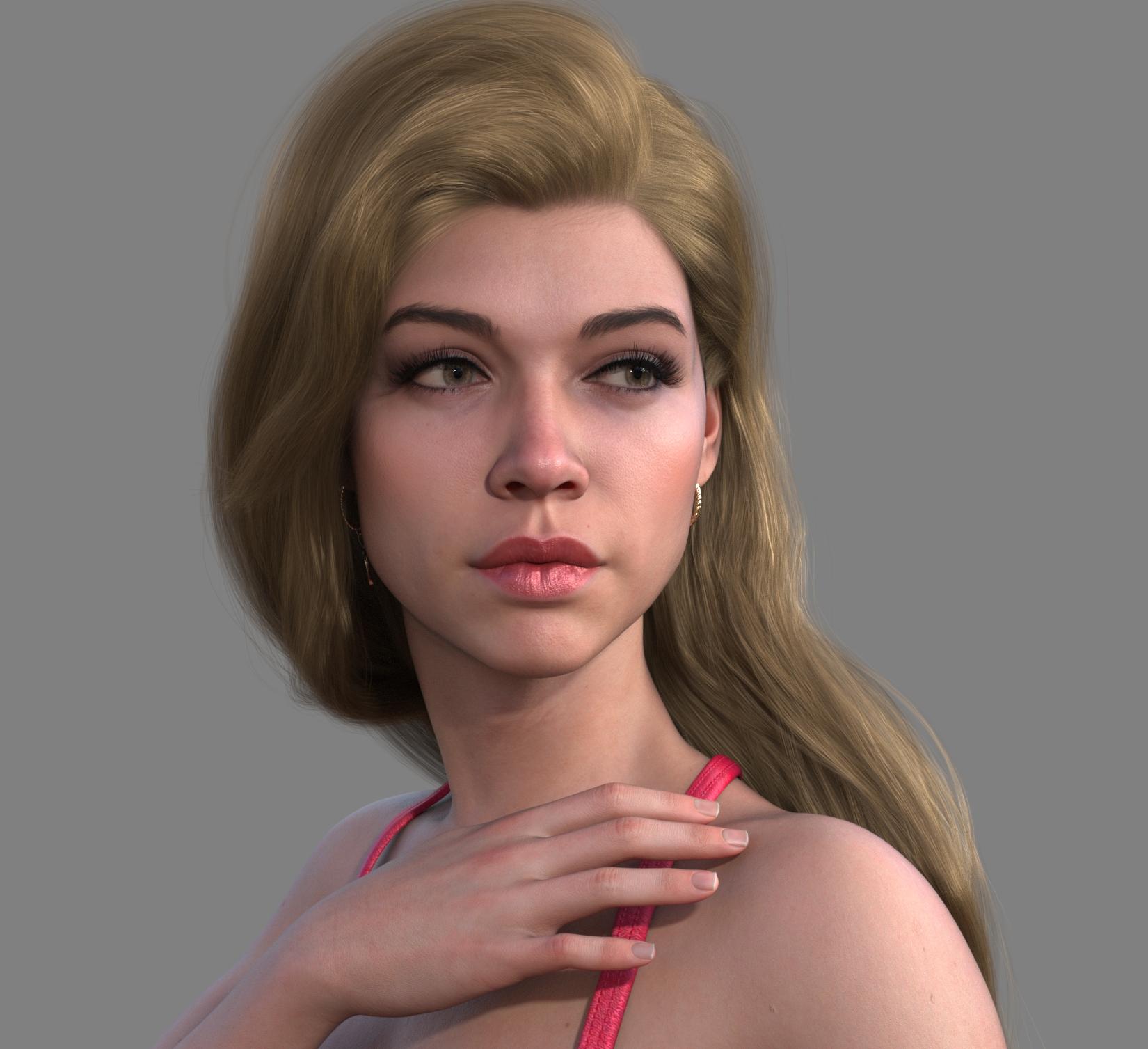 Removed Lucas body and reset all size sliders. Applied Base Feminine and Petite Goddess body (gratuitous, I know, but it helps achieve the frame). Applied Ashley 9's eyelashes, increased lip size (70% lower, 32% upper), reduced nose size (-24.5%), made face rounder (44.2%) and applied Face Transfer Female Fix (30%). The makeup is 01 of Mira 9's set. The eyebrows belong to CJ Sage. The only thing I couldn't find a fix for was the actual skin.