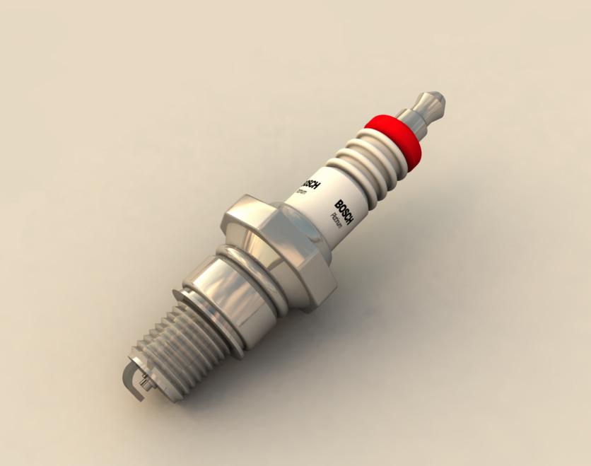 Hi there! Well yes I did that model about three years ago, what I did was to model separated parts, I did this because I had no idea that you could select part of the geometry and assign a new shader domine to that selection, so what I had was about six parts on the spark-plug, for the white part with the Bosh logo I draw it in Illustrator a rectangle more than less of the space I thought it would be enought to wrap that part of the spark with the logo placed there, here is the logo image: