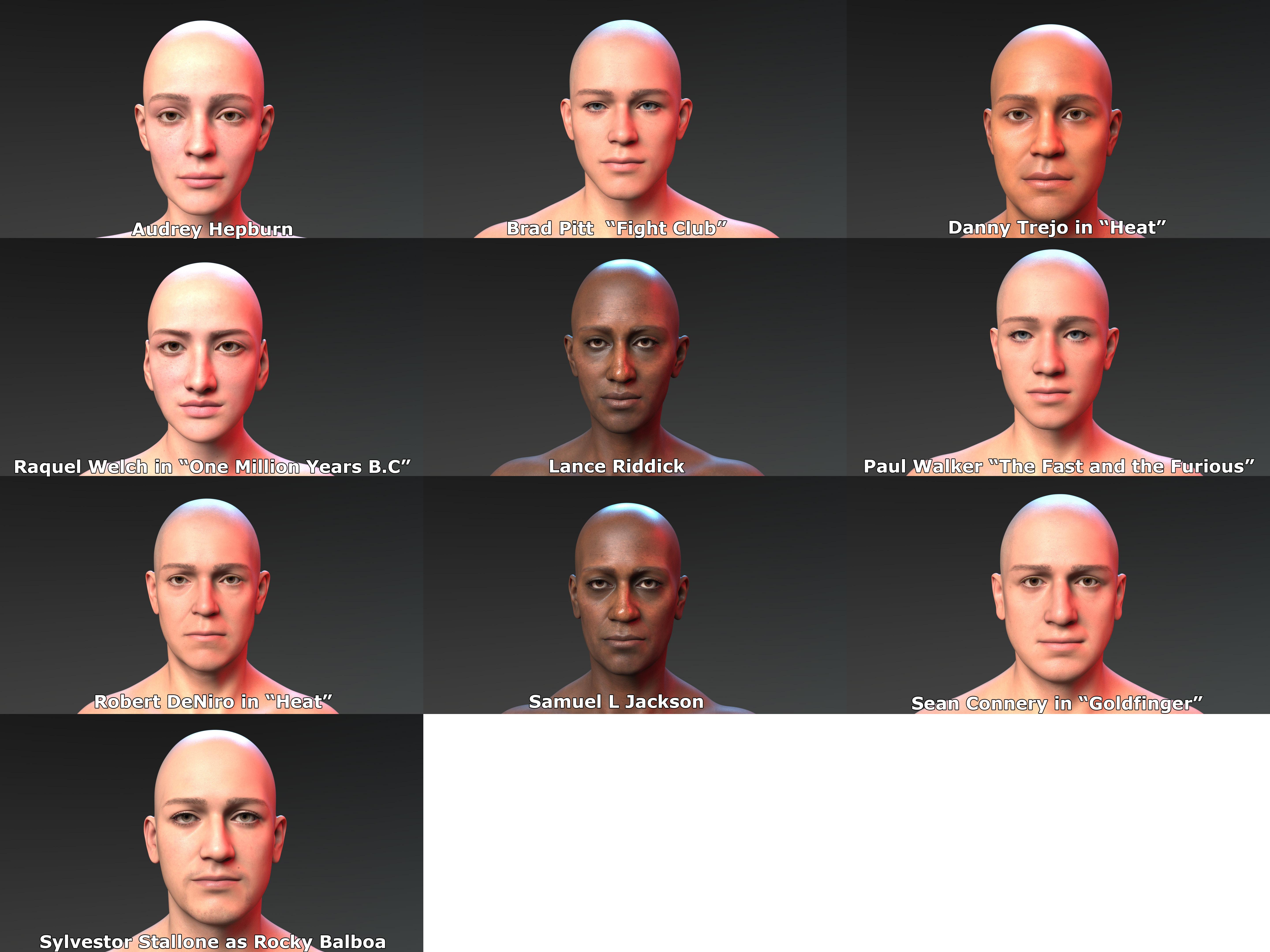 "Audrey Hepburn at age 26"; Brad Pitt how he looked in the movie "Fight Club"; Danny Trejo from the movie "Heat"; Jo Raquel Welch, how she looked at age 26, in the movie "One Million Years B.C."; Lance Reddick; Actor Paul Walker, caucasian male,"The Fast and the Furious"; Rober DeNiro, how he looked in the movie "Heat"; Samuel L. Jackson, Sean Connery at age 34, how he looked in the movie "Goldfinger"; Actor Sylvestor Stallone as the Italian boxer Rocky Balboa.