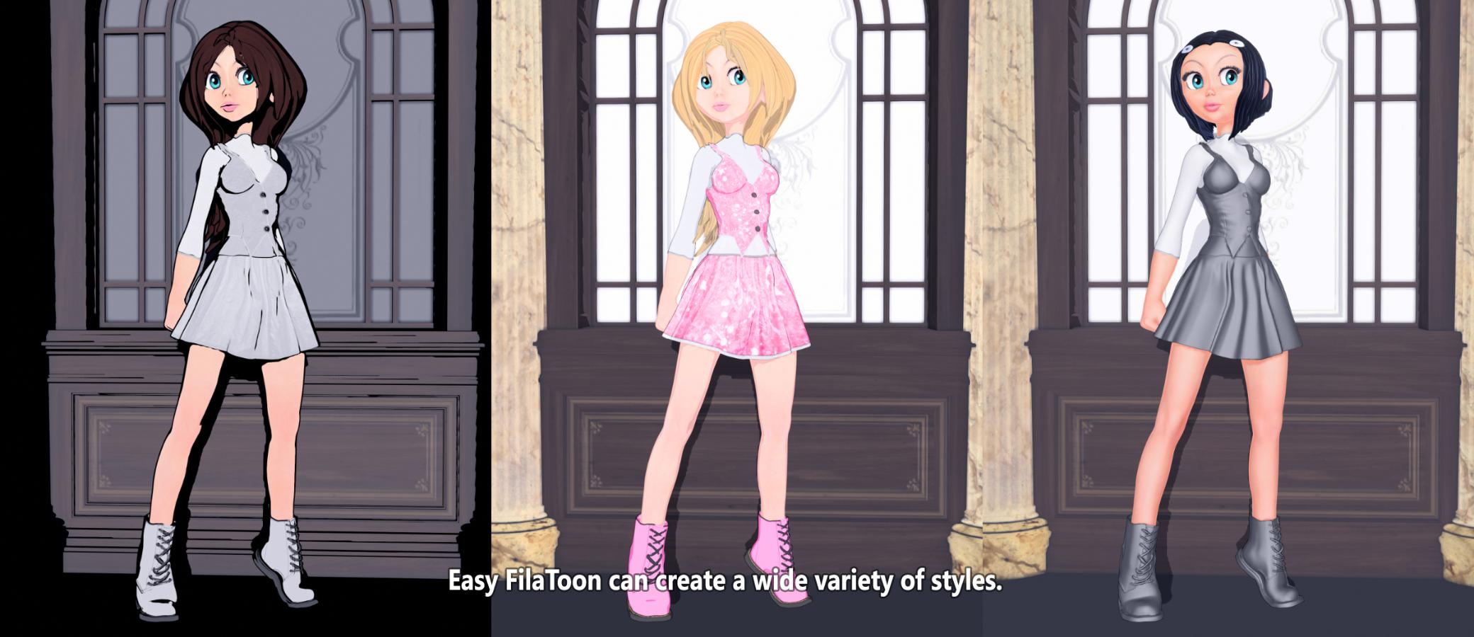 Easy FilaToon is a full suite designed to help you turn your scenes and existing characters into Filatoon characters and scenes. It includes scripts to help create Filatoon scenes, animations, and renders from your existing content library. Easy FilaToon can help convert your characters, clothing, props, polygon/mesh-based hair, and environments into Filatoon allowing you to utilize your existing assets more easily for Filatoon renders.