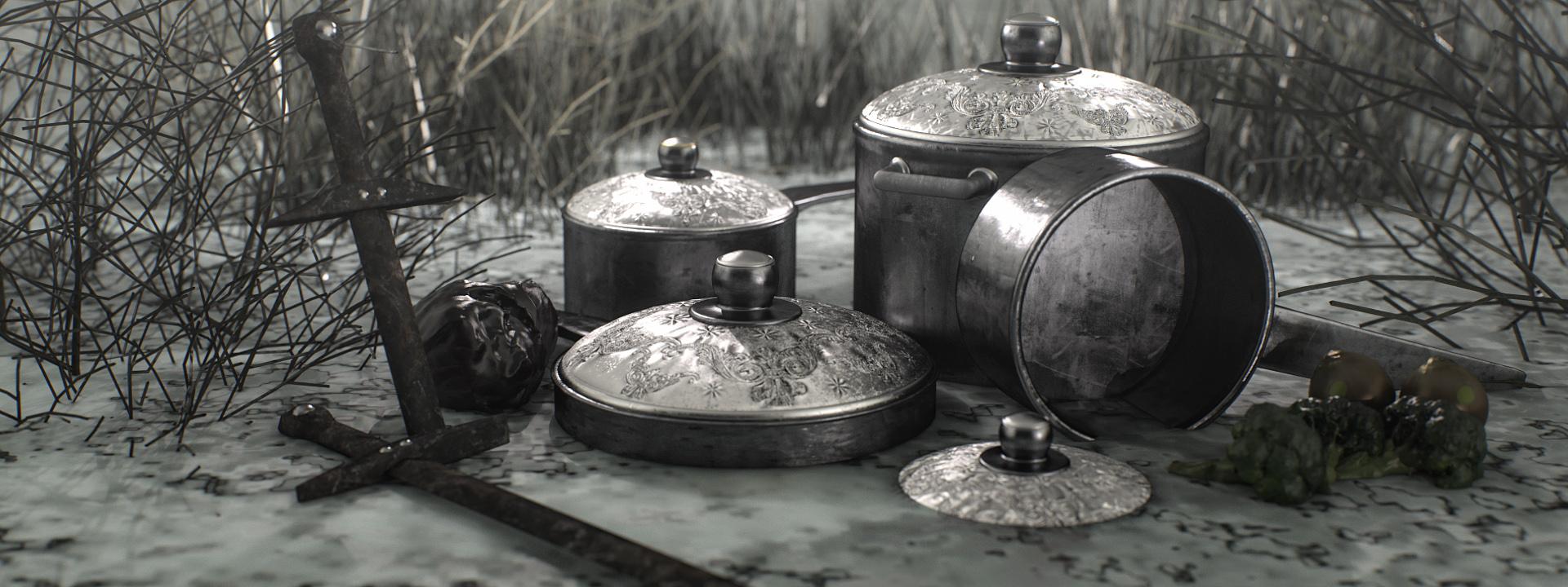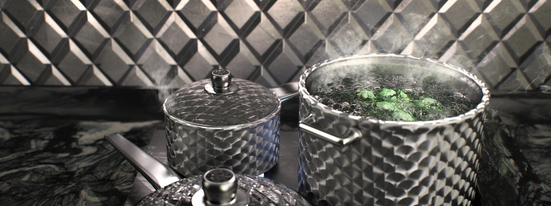 here is my last render with the pans , I build the scene with DS primitives , modeled boiling water in Zbrush on top drink water shader from vol.2 , on metals Aluminum with Circular brushed micro surface layer and for the rest Scratched Steel from vol.3 Pure Metals , on the lids used Fake Crystal from vol.2 and on the back wall just normal from the Fake Crystal plug into Top Coat of the Steel shader .