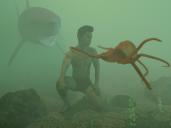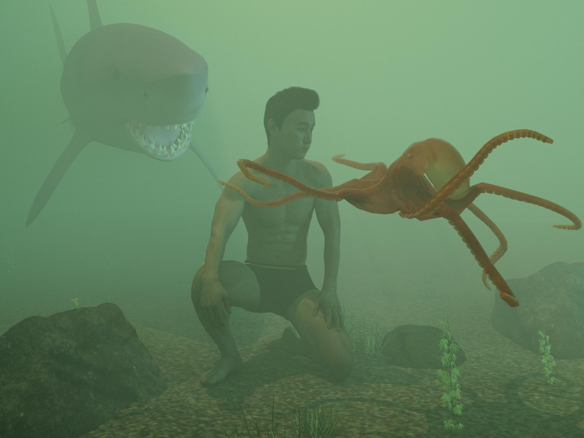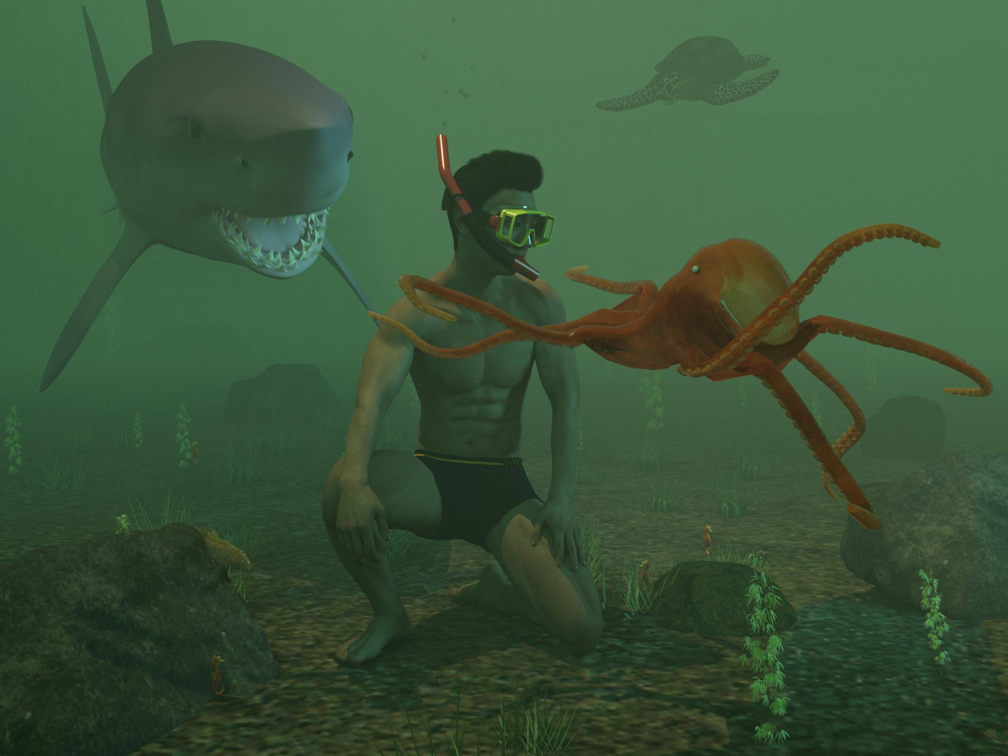I added a few more critters and used the suggestions to clear the water a little more. I set the angle to 98 and lowered the SSS to 0.000035. For the bubbles, I lowered the refraction strength to get them to show up. I added the snorkel mask so I could play with some of the plastic, rubber, and silicone shaders.