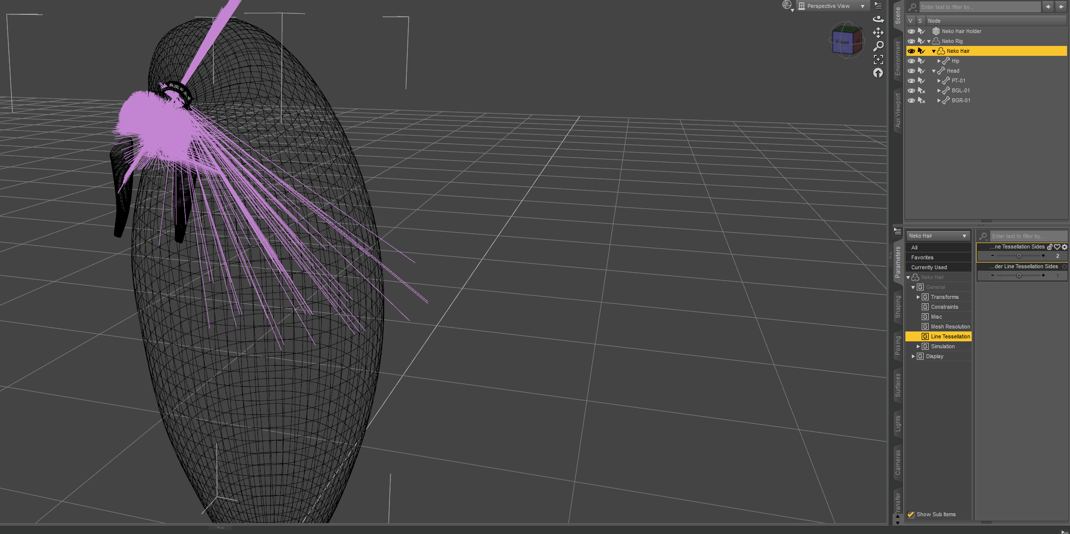 I don't have Neko hair, but I do have Tenebris hair. The Tenebris Hair is parented to the Tenebris Rig. Unparent it from the rig and parent it to the Tenebris Scalp. It then works fine for me at Line tessellation 2. It can still be posed with the rig bones, or the Active Pose tool, and it follows the head fine with regular character poses.
