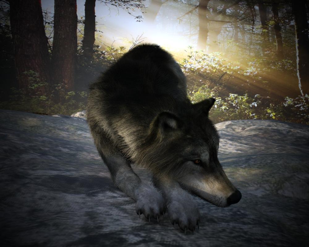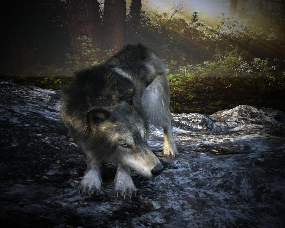 I've modified the pose a little more. I think it is closer to the reference now. After losing the fur object, I had to redo the surface settings from memory so those aren't exactly the same as the previous version. I've since written those down now. ;) With the LAMH fiberhair, it is a little like working with Dynamic Clothing. Every time you move the figure you have to redo the FiberHair export for Iray unless AM and Kendal have fixed that and I missed reading about it. Anyway, here is the latest. I changed the camera angle slightly so I think it is more in line with the reference for better comparison. I also changed the shader on the rock the wolf is on. Not sure if I like that or if I'll try another. I'm definitely keeping the lighting as I like it the more I do renders with what I have set up.