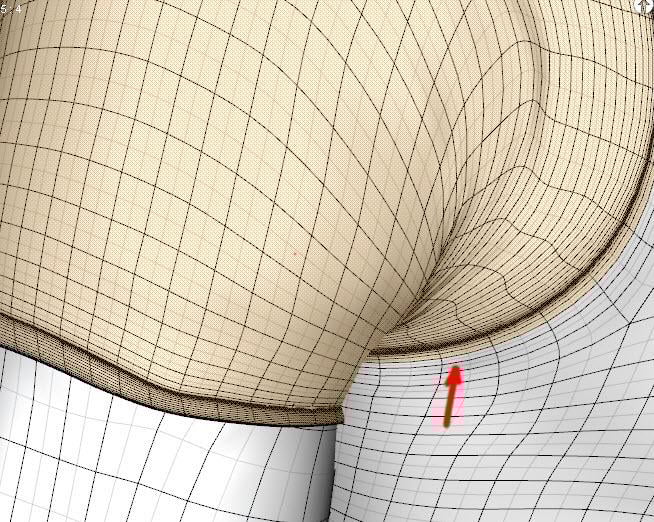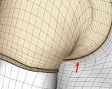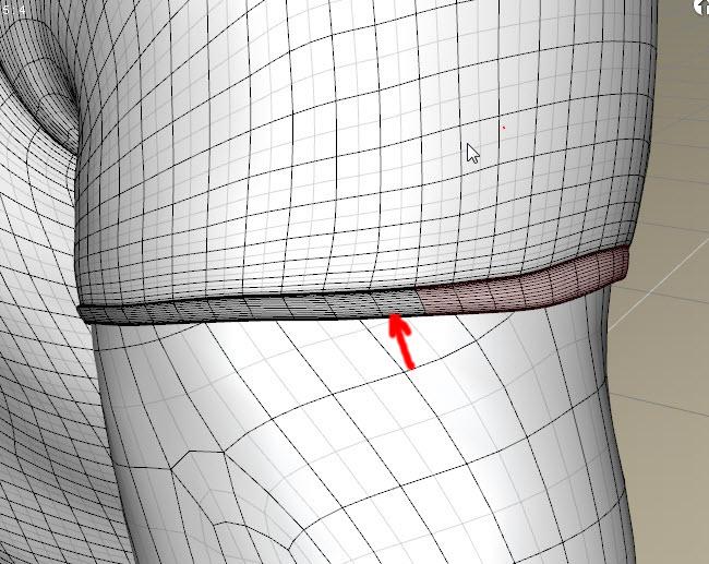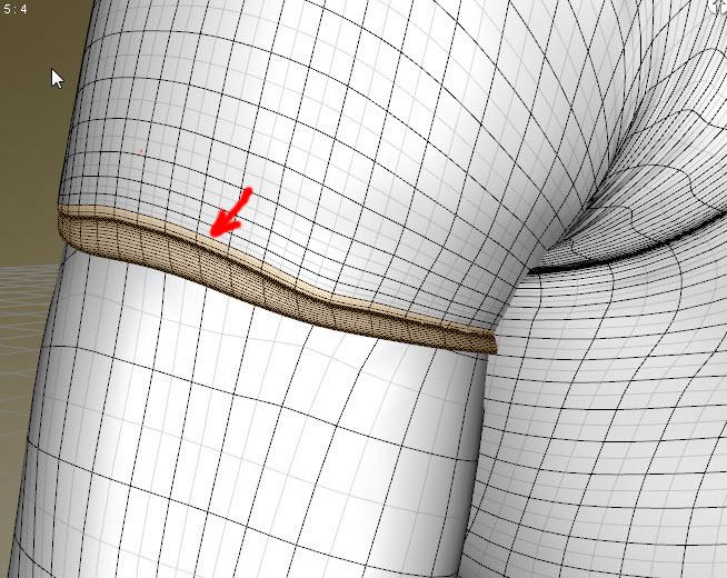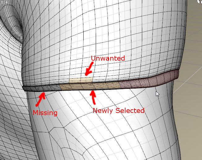 3. Rotate the camera. When you expanded the selection of the trim by using the Ctrl and the + key, you will begin to select polygons on the sleeve before you select all of the back side of the trim (see arrow in image below pointing to unselected polygons) .