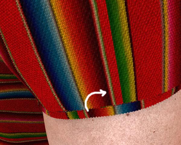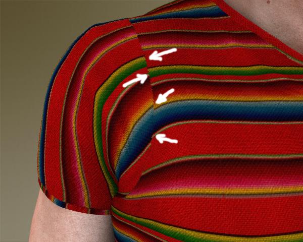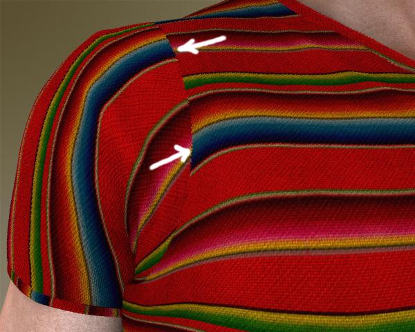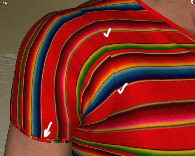 9. I was unable to get a complete match of the stripes up and down the seam by adjusting tiling (see checkmarks in image below). To do more, you would have to manipulate the UV map. Note the arm trim does not match (see arrow in image below) and needs to be adjusted.