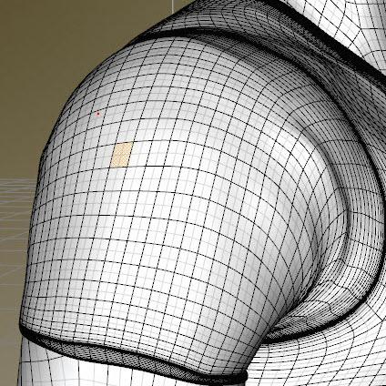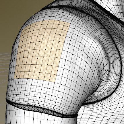 7. Rotate the camera and check that all the polygons on the shoulder and sleeve are selected. It's OK that not all the polygons on the trim are selected as we will later be creating a new surface just for the trim.