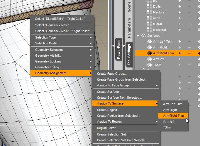 7. You can also create the Trim surface in steps. Select the front trim polygons and create a new surface, in this case "Arm Right Trim". Then rotate the camera and select polygons on the back. After selecting the polygons, add them to the selection by right clicking on the selection then selecting Geometry Assignment-Assign to Surface-Arm Right Trim.