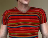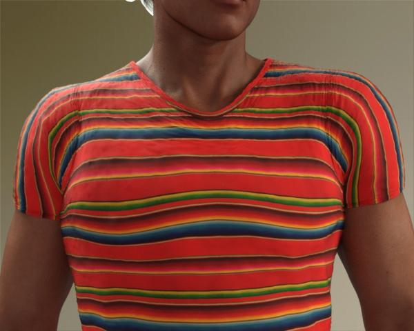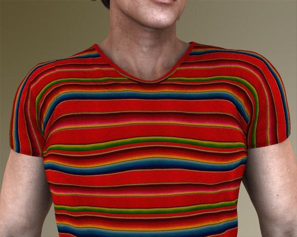 After adding two new sleeve surfaces, two new trim surfaces, and adjusting the shader tiling on each of these surfaces, here is the final result. The stripes now align across the t-shirt.