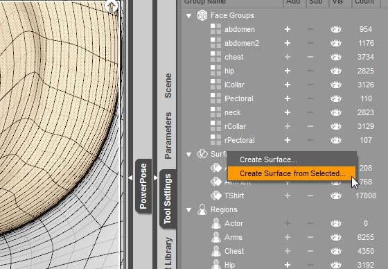 10. Now that you've selected all the polygons on the shoulder and sleeve, go to the Tool Settings tab, right-click on the word Surfaces, and choose Create Surface from Selected...