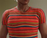 The image below shows the t-shirt with the mis-aligned stripes on the right shoulder and sleeve. The left shoulder and sleeve have already been adjusted.