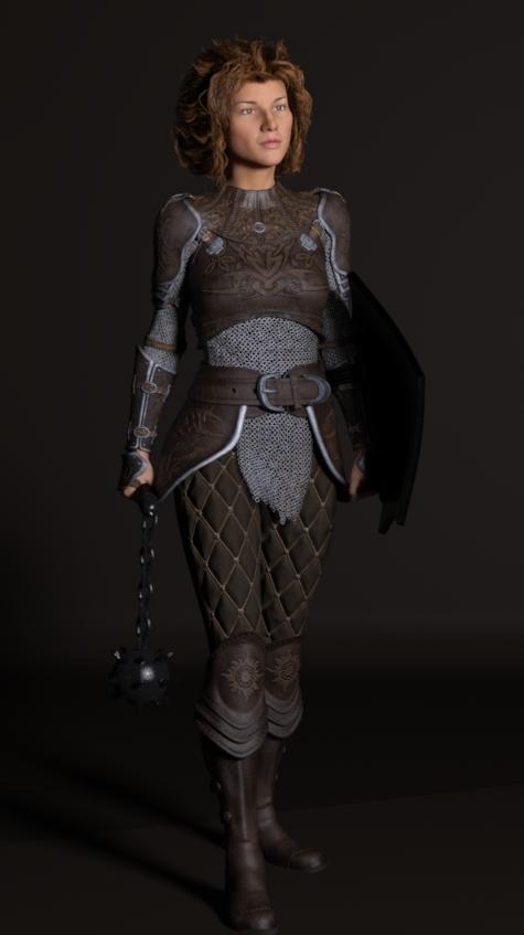 Full body camera, G3F with Charlotte face morph from Faces of Europe, Beautiful Skin material, Defender props and poses, Alicia armor. Rendered in 31 min. (CPU only):