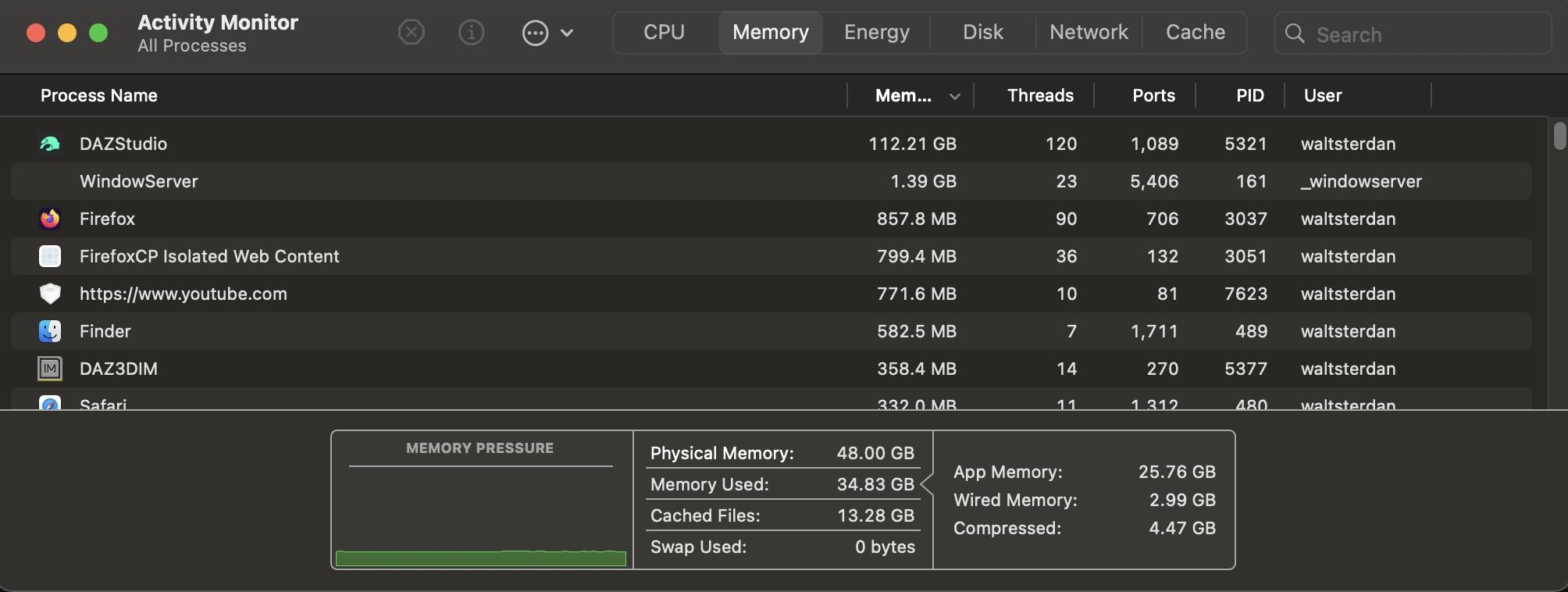 During the final render, the memory usage spiked up to 112.21 GB; it should be noted that the "Memory Pressure" window at the bottom of the Activity Monitor stayed a sold green in both cases (green indicating efficient use, yellow suggesting potential need for more RAM, and red showing that your Mac needs more RAM).