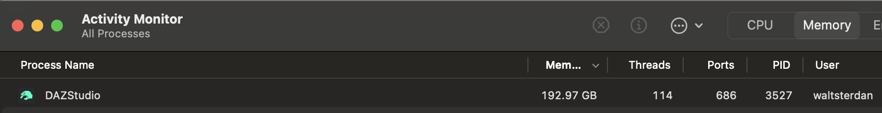 The scene, when not rendering, had DAZ Studio using under 14 GB of memory. Memory usage in the older versions of DAZ Studio drops back to this amount once the rendering has been done and saved.