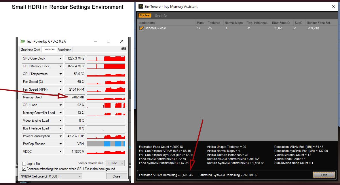 I purchased the product. It doesn't seem to take into account the graphics card memory that is used by the HDRI in the Render Settings Environment. Here are two examples. One uses the small default "ruins" HDRI. The other uses a large HDRI that I purchased. The IMA makes the same estimate for remaining VRAM in both cases, but GPU-Z shows that the actual amount of memory used is much larger with the large HDRI. Can you improve the IMA to take the Render Settings Environment HDRI into account?