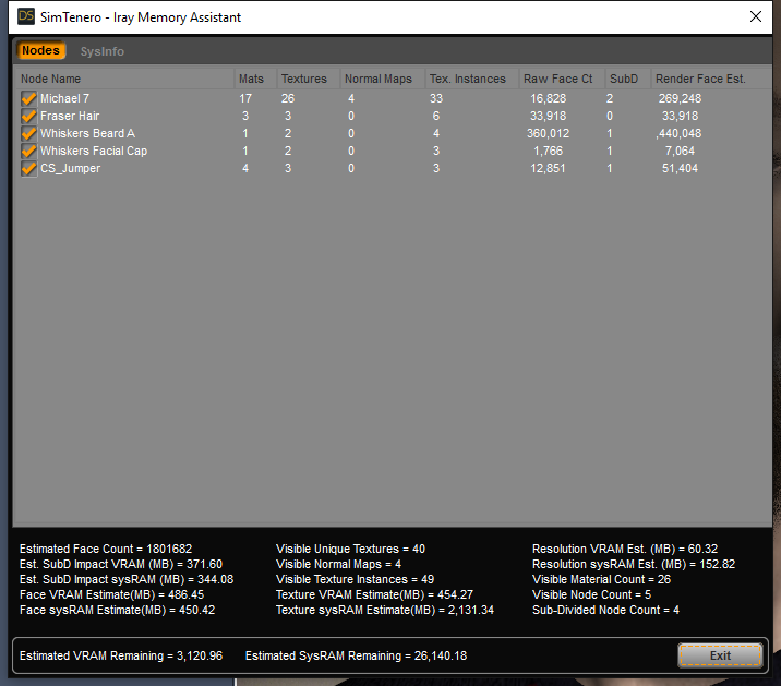 simtenero, as you are investigating things that are not accounted for, please look at geometry shells. That seems to be another thing that doesn't show up in the list in the Iray Memory Assistant. Since they have textures, I assume they take memory.