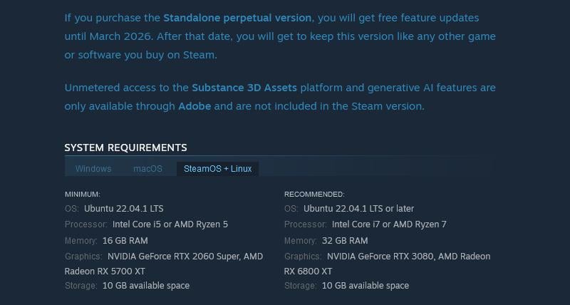 I've also taken a screenshot for convenience (and I did specifically click on the Linux tab for that), but is that for the STEAM client then, not the actual software? I mean according to that, it officially supports the LTS version of Ubuntu, and even more promising is that my system beats the minimum spec and actually meets the recommended spec, in fact I have the exact processor recommended (Ryzen 7).
