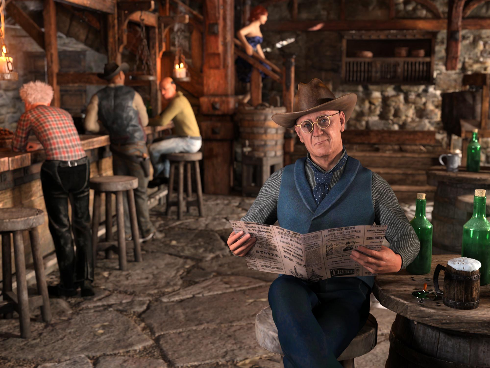 @Greybro I'm so glad you like the images. According to the times on intermediate scenes versions that I saved along the way, I spent 8 hours on this particular scene. I'd say half of that was setting up the scene, and the other half was tweaking things after the basic scene was setup. Lighting was a challenge and getting it to fit in my GPU was a challenge. I kept deleting unseen parts of the Inn props and removing other props not important to the story. The woman coming down the stairs is a LowPi. The three characters at the bar a set to base resolution and parts under clothes are hidden. I often try many changes and camera angles before settling on a final image to post. I'm retired. I have the time to play.