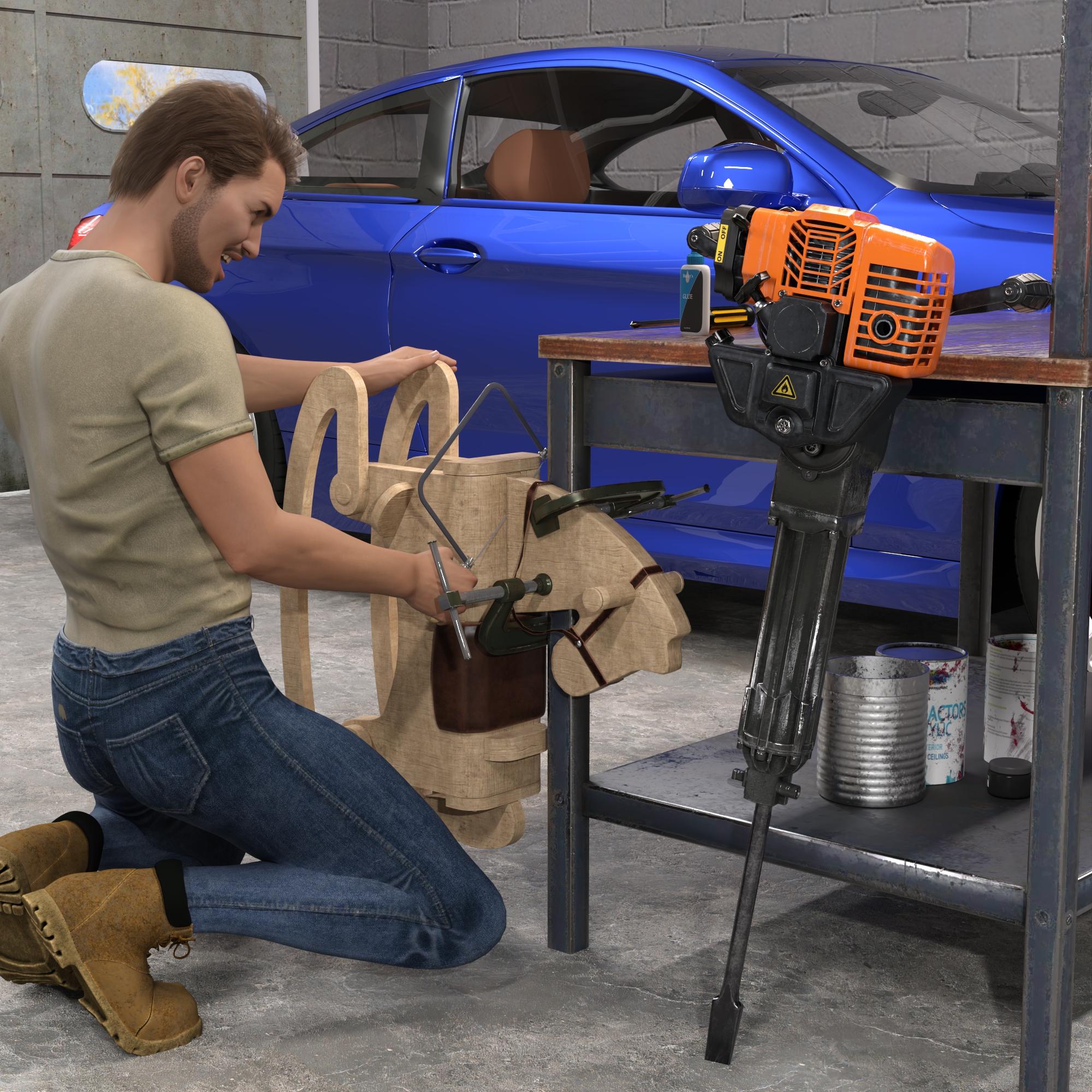 Well since Jack has handcuffs, maybe he is an undercover cop and also has https://www.daz3d.com/thief-tools. But a guy's garage needs to be kitted out with https://www.daz3d.com/everyday-tools, https://www.daz3d.com/big-time-tools, https://www.daz3d.com/woodworking-tools-1, and https://www.daz3d.com/lawn-tools-and-poses-for-genesis-8-male-s-and-female-s. I stayed away from the monster drill presses and such that made up my dad's metal shop in the garage. (He built working quarter-inch scale models of historic steam locamotives.)