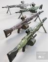 Material presets include both Iray and 3Delight versions. The pistol has two material options and the machinegun has six.