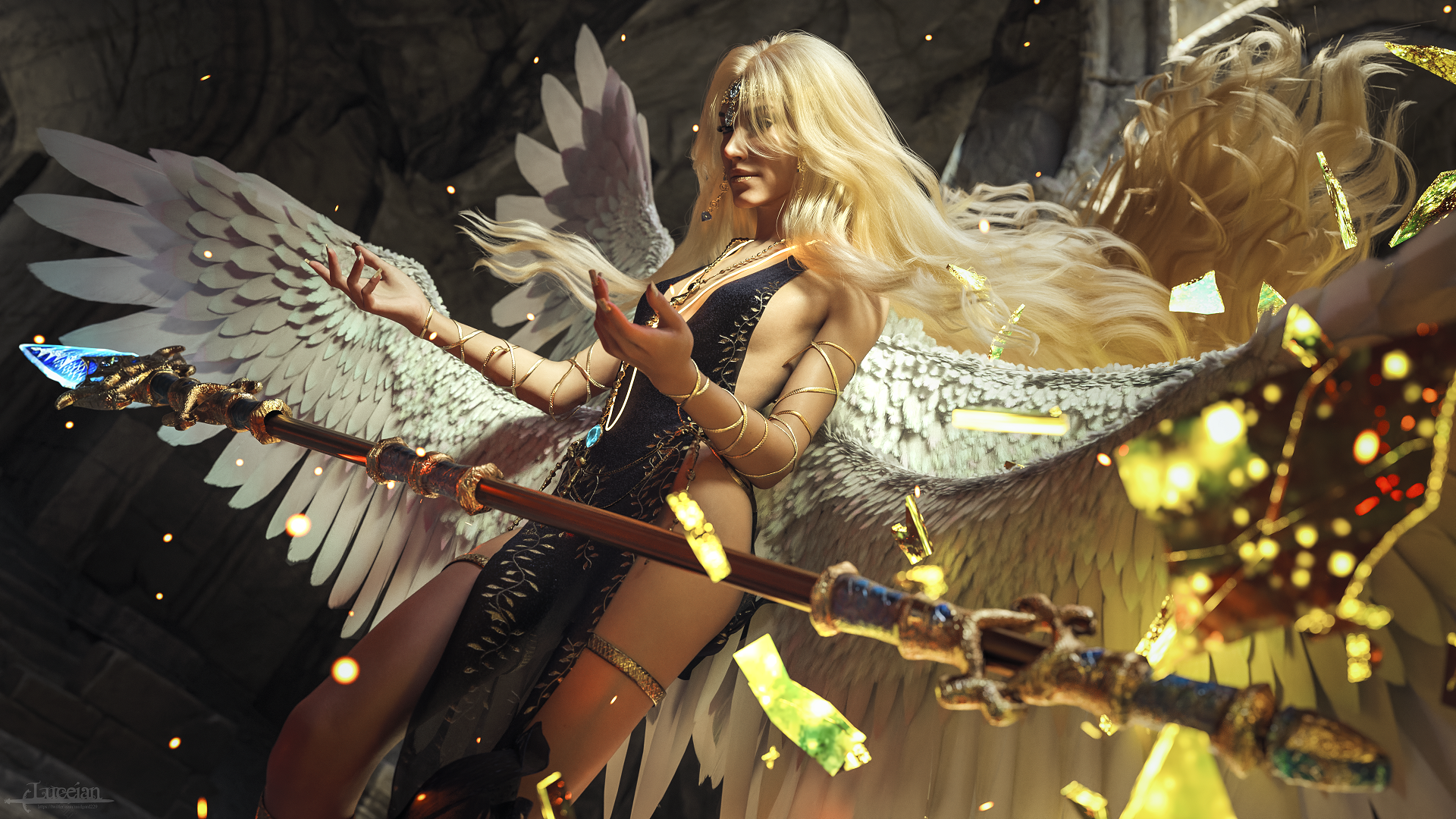 I don't care for the figure, much too skinny and also kindau unfriendly face, to me at least, but I do like the feathery dress and that the wings set has one pair fhat is actually attached to the arms, as if they were incorporated in the wings. Been waiting for something like that, very nice. - Am wondering, though, why the Avello texture add-on for the dress would the other texture add-on? Doesn't make sense, no?