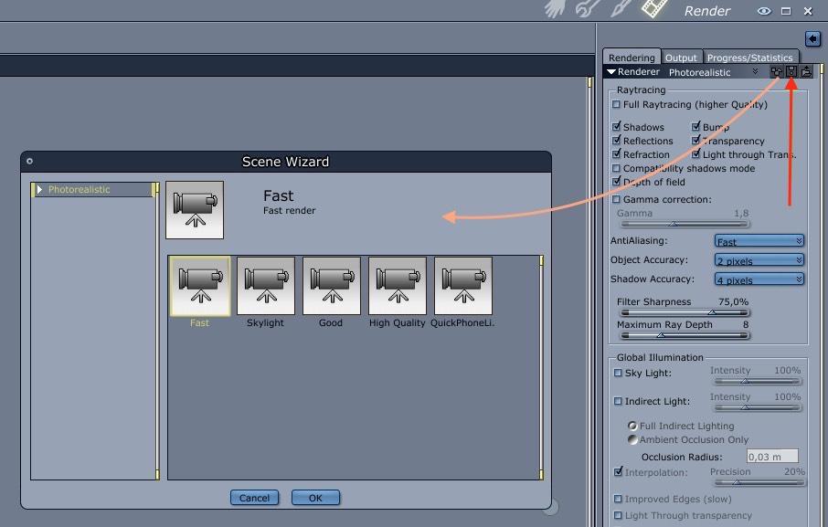 You can also make your own presets by altering the settings in the properties pane and clicking the save-icon (red arrow) to save it.
