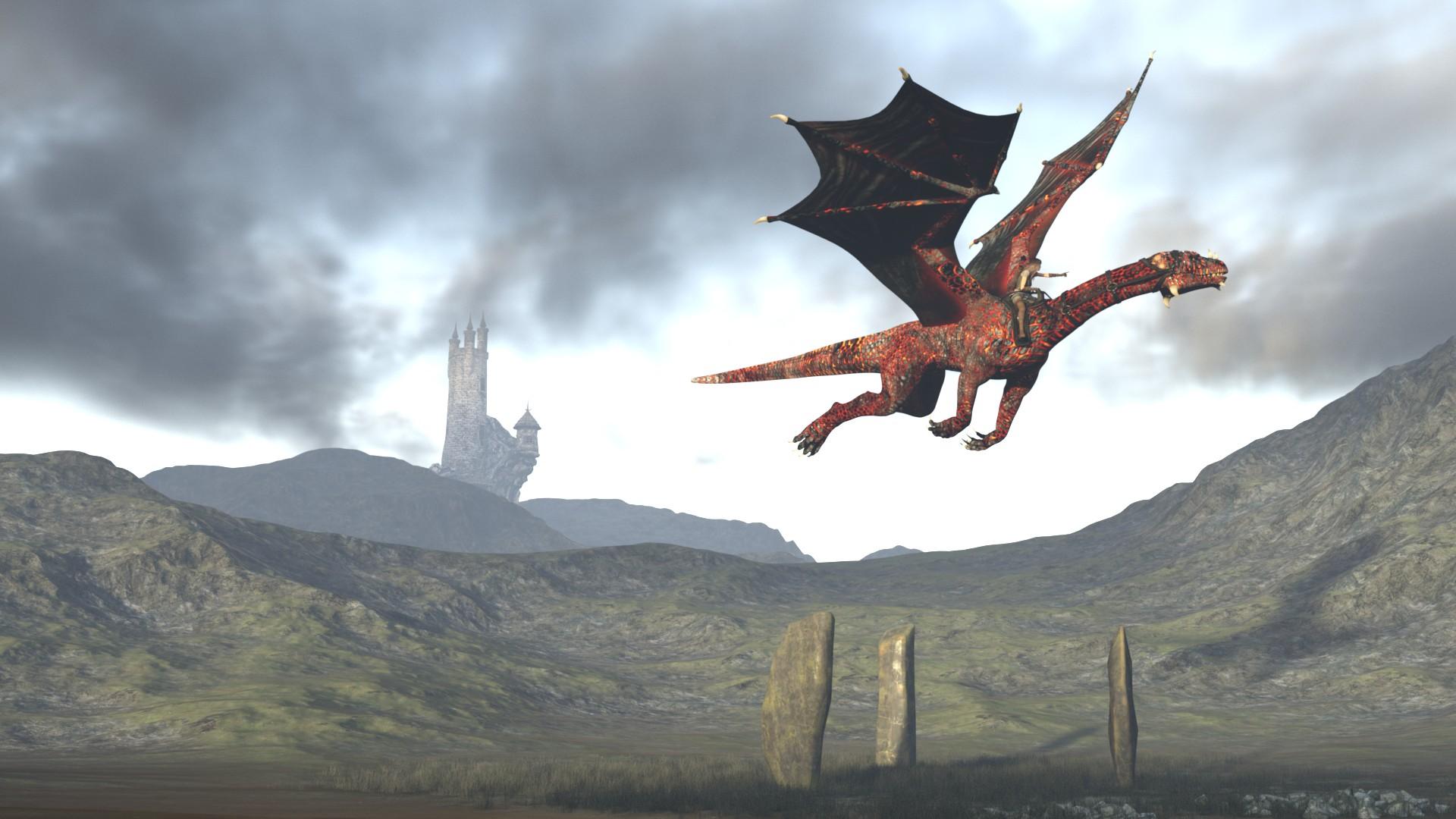 Two images of Alessa G2F First on a dragon, flying over an empty landscape with a tower in the background.