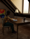 Here is a more relaxed and quiet render: https://www.daz3d.com/candy-slims-jeans-for-genesis-2-female-s by WildDesigns with the sweater from https://www.daz3d.com/autumn-chill-for-genesis-2-female-s also by WildDesign with another texture pack available: https://www.daz3d.com/coldsnap-for-autumn-chill  by Jessaii and Raziel. The slippers are from https://www.daz3d.com/nitetime-outfit-for-genesis-2-female-s by Nikisatezhttps://www.daz3d.com/micah-hair by AprilYSH includes a male and female version. The character is https://www.daz3d.com/nyota-victoria-6 by gypsyangel. Not g2 but the fountain pen Nyota is using is a freebie from @richardandtracyhttps://www.renderosity.com/freestuff/items/95165/cheap-fountain-pen (commercial use allowed). Many thanks, Richard!