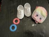I found a pair of white shoes for $2 in the Walmart clearance area. They are a tad snug, but they did go on okay. They came with a backpack and 2 hair ties. Great deal for $2!
