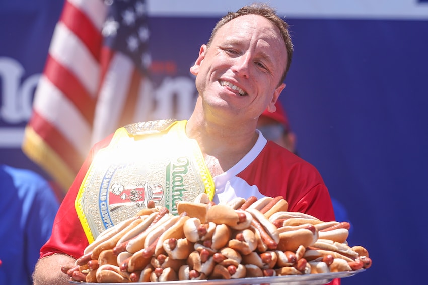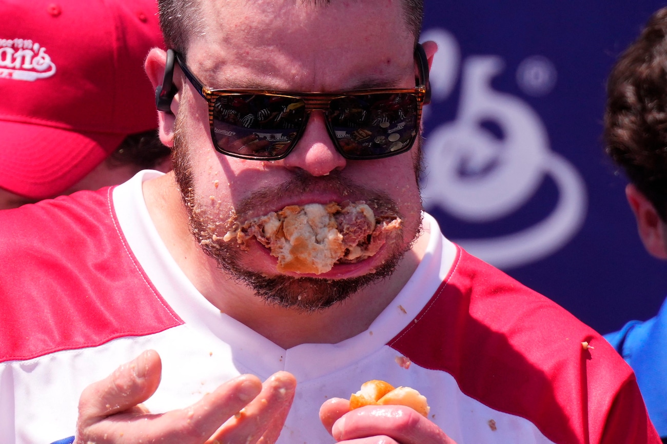 The winner.  Apparently still alive and well after having eaten 70 hotdogs in 10 minutes...