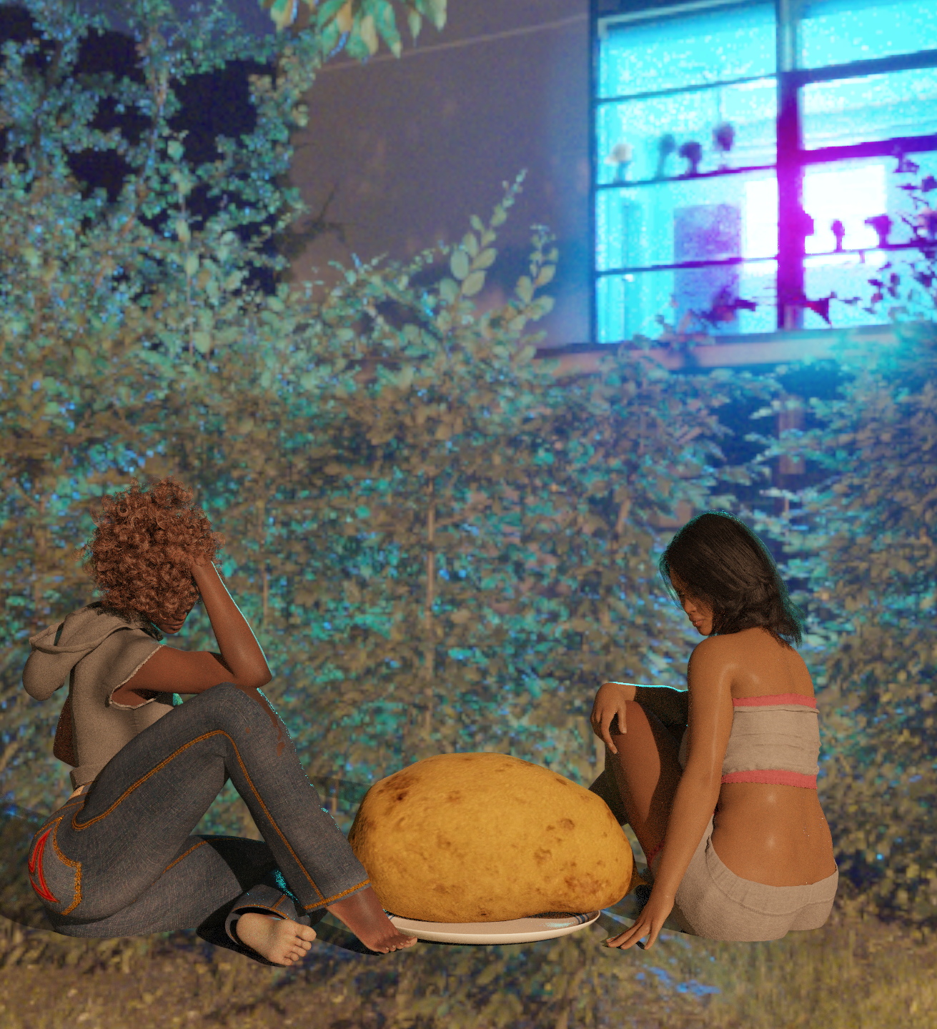 Two black girls sitting with a giant potato on a plate.
