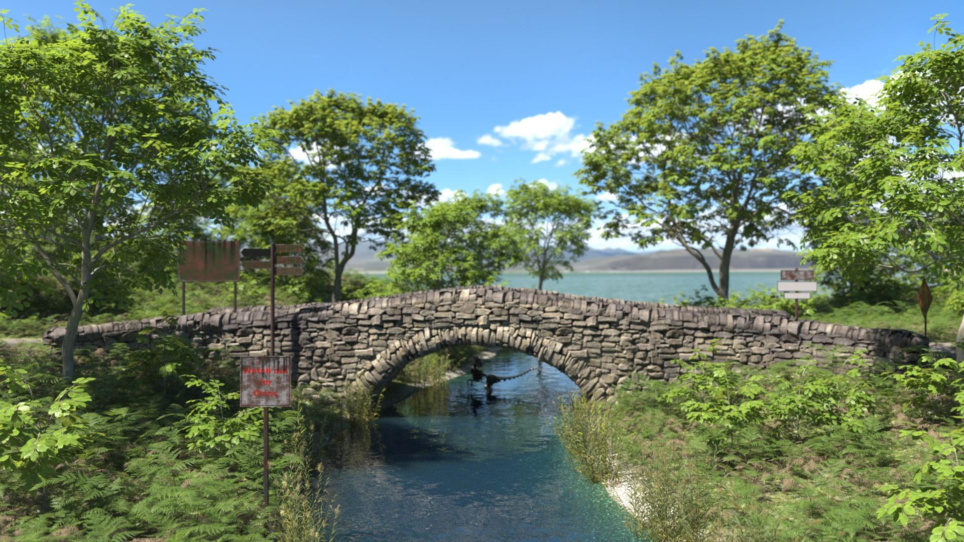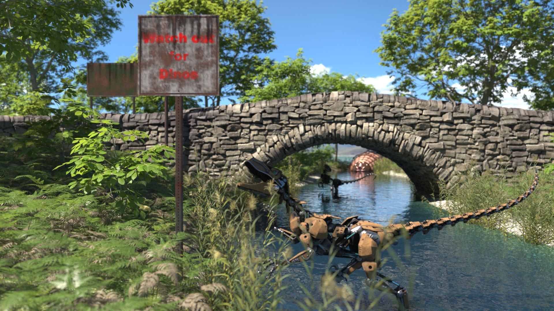 If I may sneak in a tiny tip: the text on the Dino warning sign looks super clean, even with the dirt overlay. If your goal is photorealism and you used the additional writing area, you might consider going for a deeper red and lowering the cutout opacity just a bit (of the additional writing area surface). But if the goal is to make the panel stand out in the scene to save people's lives, then leave it as is — it definitely gets the message across. A solid, fair Dino warning !!! ;)