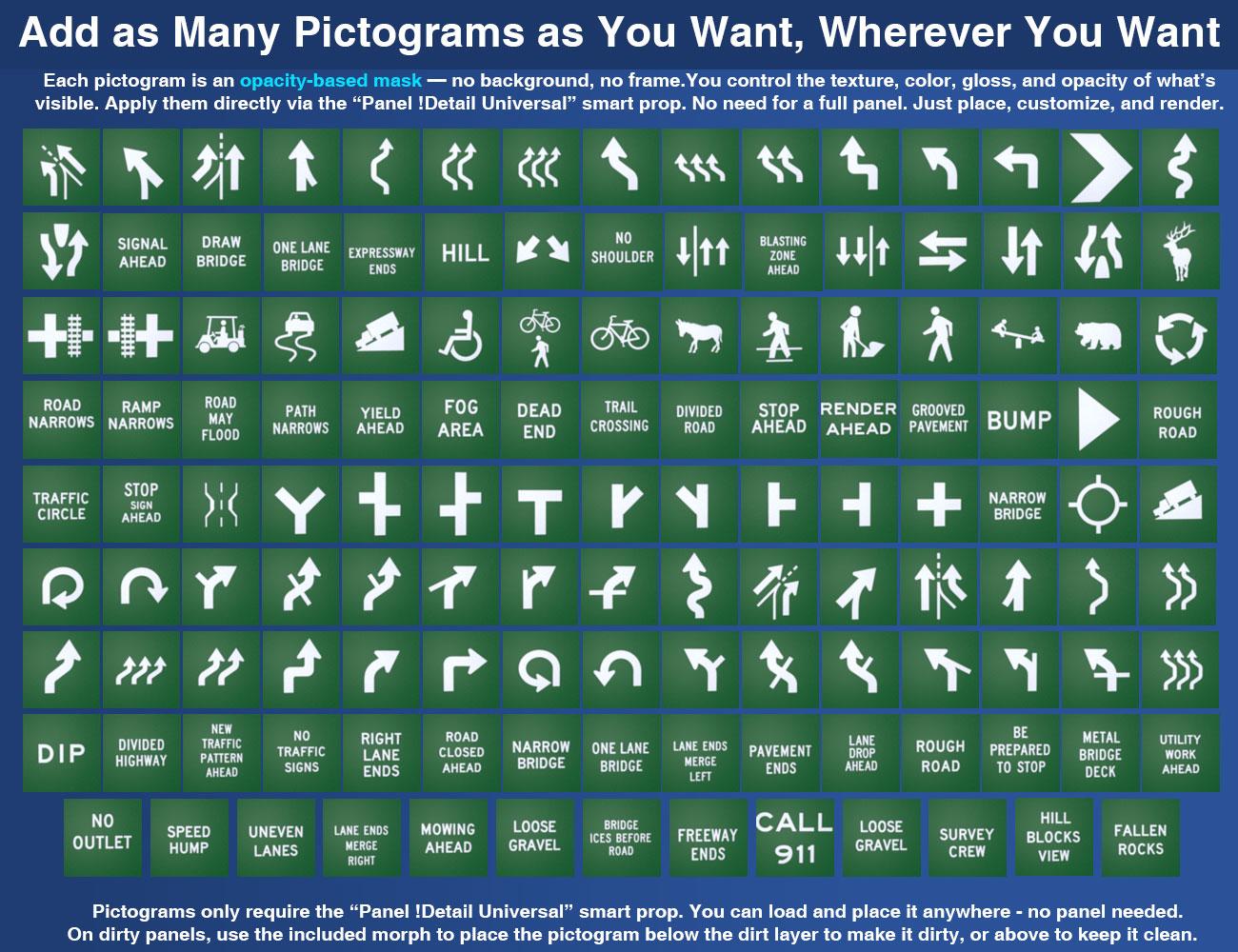 • Insert pictograms as smart props using opacity maps — more than 130 patterns included, clean or damaged, aligned or off-kilter.