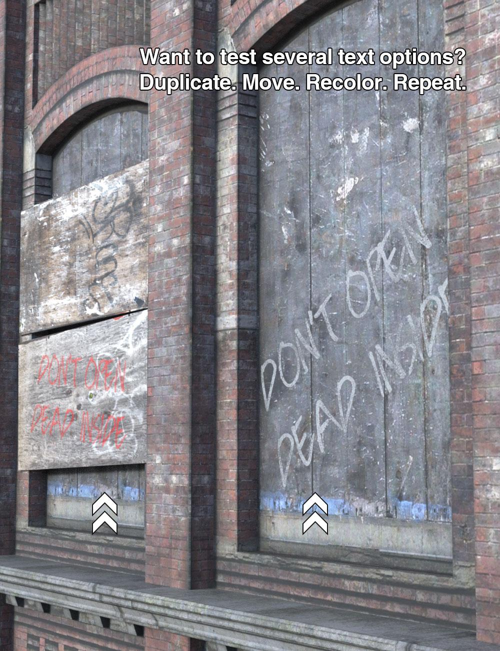 Add house numbers, street names, locker or mailbox labels, “No Trespassing” signs, hotel door plaques, warehouse markers, zone IDs, public signage, sci-fi caution labels — or go large-scale with full billboards, dystopian alerts, or sprawling industrial ads.