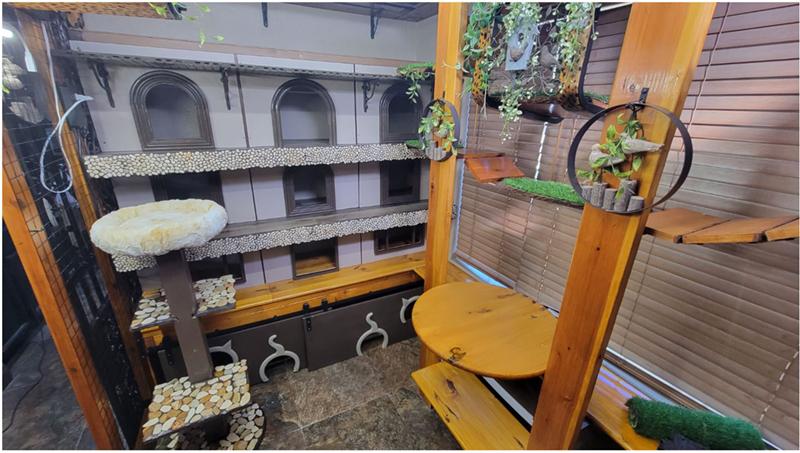 Thank you. This is why I am late on my books. Yes I am a bad author. The indoor dining-room has three other walls finally finished. I love the forest park wall better than the condo wall. I also have another larger catio that was once a huge master bathroom. Yes I need intervention lol. I am almost done with the outside catio village (2 stories high). So exhausted. Shake my head wondering why I do this for feral cats. Maybe it is because I am a Leo or maybe it is because I was raised like a trapped animal in a basement and know what the scent/hope of freedom (fresh air) smells like.