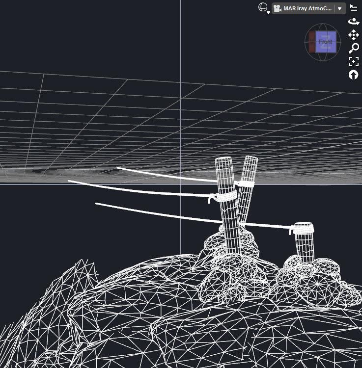The second render is Iray. I wanted to see how easy or hard it would be to recreate the foggy scene. I used the camera and lights from AtmoCam for Iray and changed color and density to try to get a similar scene. It took a while to find the fog prop - it's attached to the camera, you have to use Hidden Line DrawStyle to see it, but since it covers the entire scene, you don't really see it unless you move it. Once you do, you'll see elements of the scene coming into view: