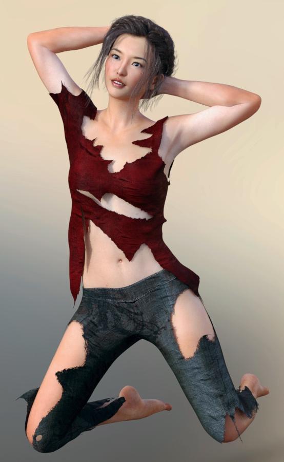 Virtual World outdid themself with Akiko. Love her skin and features! BTW, if you haven't tried using the Visemes for expressions, try it! This is "IH" at 23.5% with "K" at 60.5%, and it gives you a nice open-mouthed expression. Visemes are under Parameters>Pose Controls. She's wearing Anjou Hair with the Soulless Outfit. (Currently 66% off.)