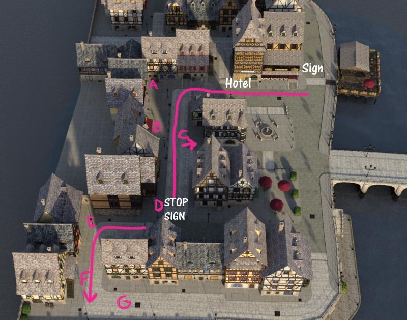 #5. Standing in the street where the word "Hotel" is on the map, and shooting toward the red building and Hotel. We are going to turn to our left toward the building with the pink/red shutters and into the shadows, and continue down the street toward "A"
