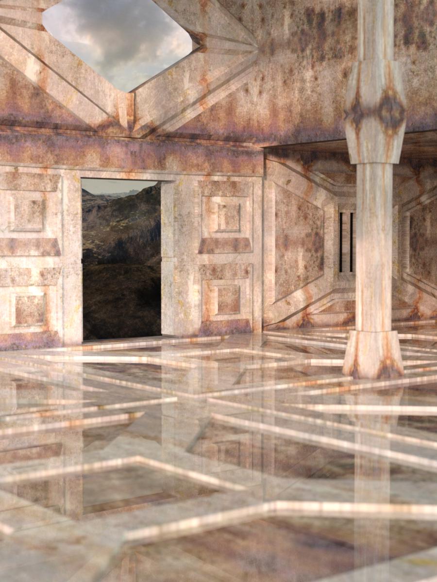 I loaded one of the presets to get this. The floors I reshaded using the default iray shader, the architectural one as it gives a nice gloss to floors. :D The rest of it I just used the normal default iray shader that we all have with DS. Then I loaded a plane behind the door and added one of Didi Mc's backgrounds to it (it's one of her older ones, can't think of the name...think it was East of the Sun...available at rendo) to make it look like a sci fi building. The modules are quite sci fi looking with the extisting textures, but I really think they would suit fantasy as well, if you use the right shaders.