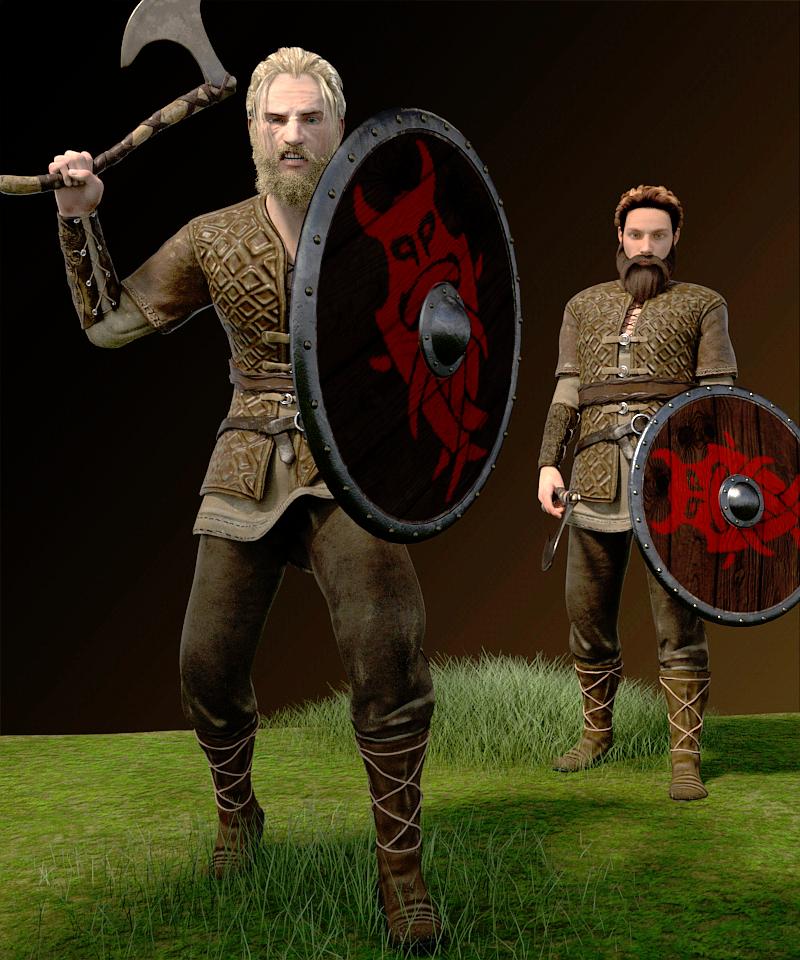 This features a new wardrobe set I bought last week: Nordic Warrior for Genesis 3 Male. I show it on both G3M (right figure) and G2M (left figure). The fit to G2M went very smoothly using the clone from Genesis 3 Male for Genesis 2 Male. In addition to the clothes, G3M has Bold Hair and Whiskers for Genesis 3 Male. G2M has Ancient Combat Hair for Genesis 2 Male and Mec4D Unshaven 2 for Genesis 2 Male. It also has Aging Morphs 2 for Genesis 2 Male applied. Grounds and grass from Grassy Grounds Megapack. Lights were from Painter's Lights. Iray render.