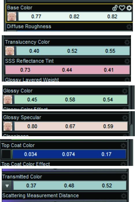 This one changes the translucency weight back to .65 Translucency Color 129 / 97 / 48 SSS Reflectance Tint 169 / 144 / 123