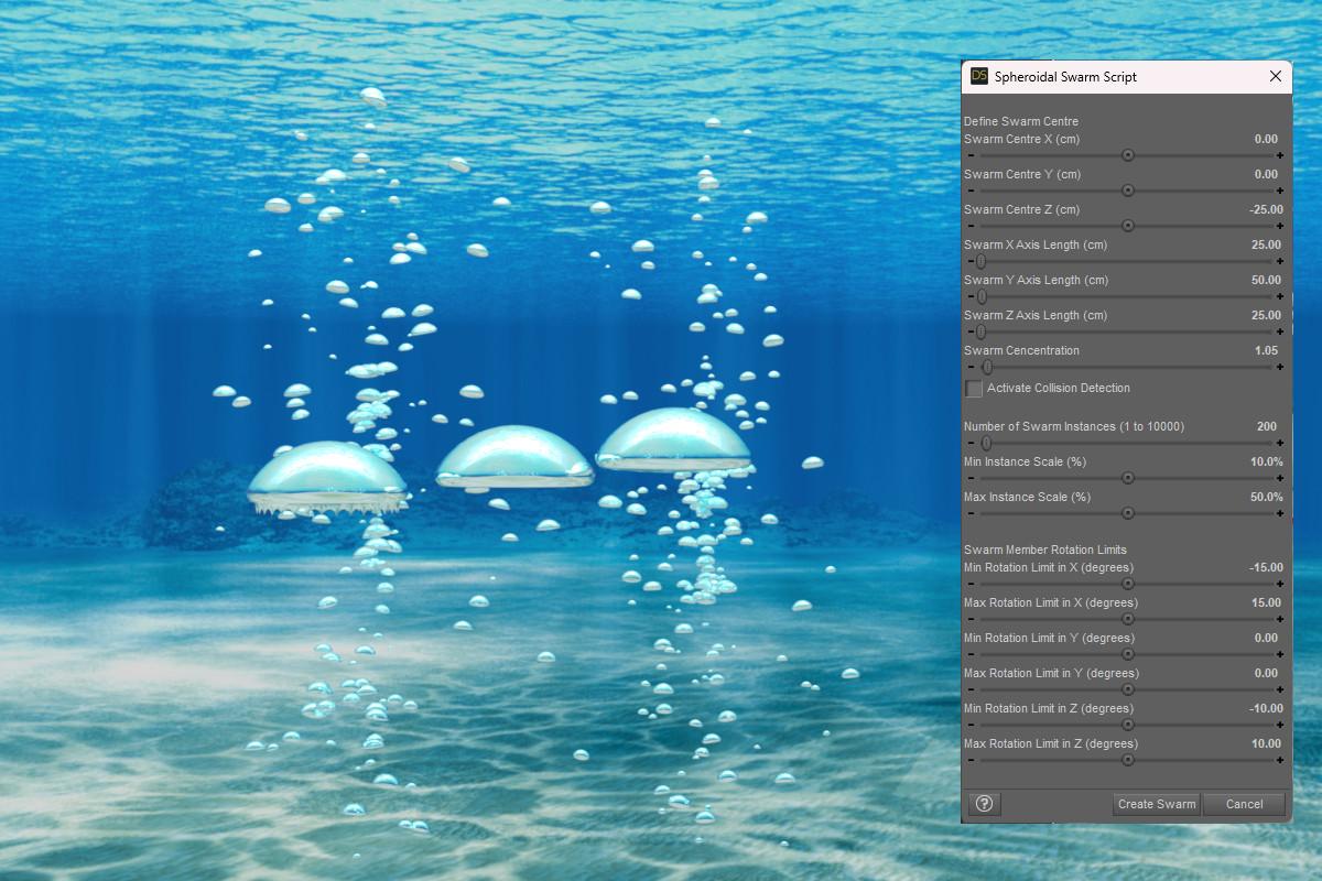 Bubbles don't stay as spheres as they rise through water. The underside flattens, becomes convex, concave or a bit like a jellyfish. So, there are three bubbles shapes to swarm if you want to. Might be the most unexpected download you'll ever make! The image shows two of the bubbles swarmed in the background, and all three bubbles in the foreground. All three bubbles are 6cm across.