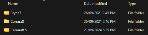 Took the plunge and updated my oldest computer to Win 11. Not a clean install but opted for the update which allowed me to keep all my apps data etc. So far so good. Carrara 8.1 works as expected. Carrara 8.5 works, Octane for Carrara works but I had to sing in to my Octane acct. and it works. Hex works, and the bridge to daz. Zip and Rar files crash the explorer window. did some research, uninstalled CS4, zip rar files are now ok. DS4.10 and DS4.21 work.