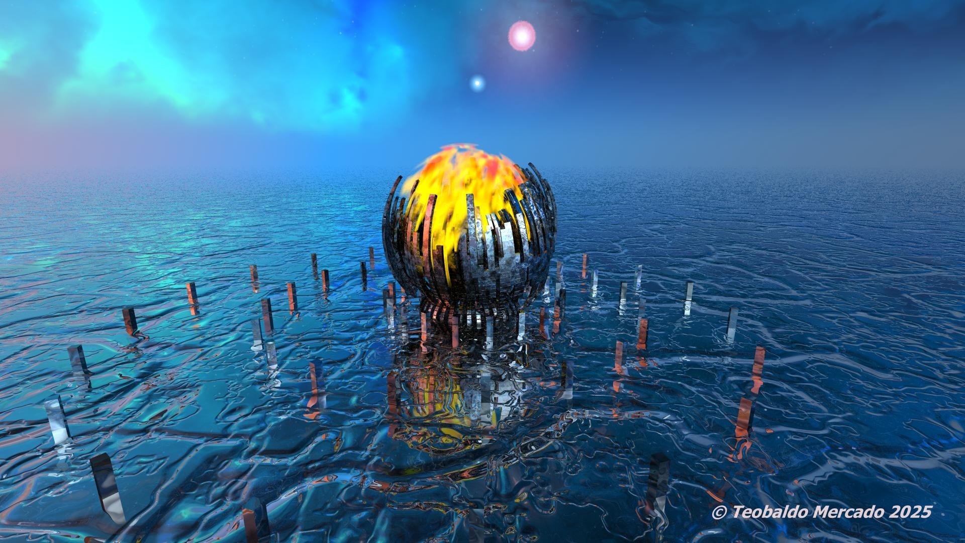 The background is Deep Space, the water is a Bryce texture modified by me, the object is created with Structure Synth.
