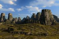 This is the cover I made for a story I'll be making available for free download on my blog. I used several free objects, including a 2D "monster" I built using texture cutouts (a method I don't plan on repeating due to the slowness of the process). The atmosphere and terrain are the ones that come with Bryce, modified to achieve the desired effect.